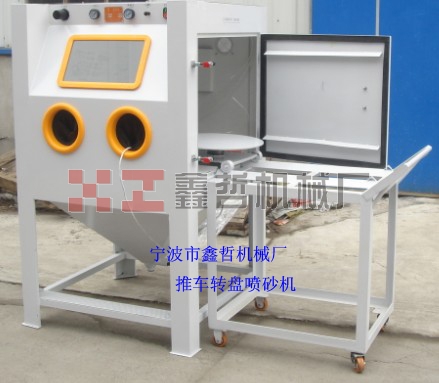 2、加裝活動臺車和轉(zhuǎn)盤,操作時僅需將工件放在臺車轉(zhuǎn)盤上,然后將工件推入機(jī)內(nèi)即可從事噴砂作業(yè),十分簡單省力,可加裝定時加熱器防止玻璃珠 受潮。